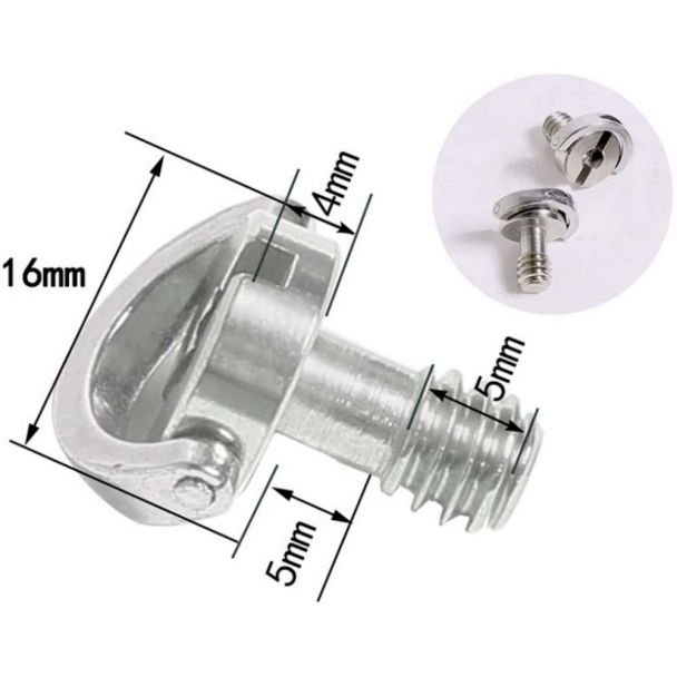 (Vervangende) schroef voor snelkoppelingsplaten platen. Aansluiting is 1/4 draad (standaard camera aansluiting). Pin/draad lengte 10mm waarvan 5mm voorzien is van schroefdraad. Totale lengte (dikte) is 14mm. Doorsnede bovenzijde 12mm. (16mm incl. oog)