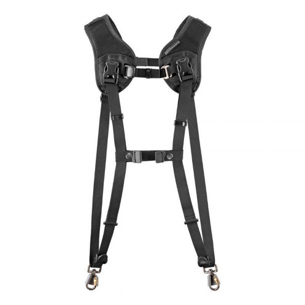 De lengte van elke riem kan worden aangepast van 91 tot en met 160 centimeter en de riem zelf is 2.5 centimeter breed. De geveerde bumper locks kunnen eenvoudig omhoog en omlaag geschoven worden langs de riem waardoor u zelf de speling van uw camera kunt bepalen. Wanneer u de optionele BlackRapid Binocular Breathe Strap bevestigt, kunt u ook nog uw verrekijker aan het harnas hangen. Deze strap vindt u onder het tabblad "Accessoires". Wanneer u slechts een enkele camera mee wilt nemen kunt u de Double Slim Breathe loskoppelen zodat u twee schouderriemen ter beschikking hebt.