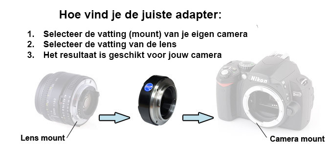 Adapters zijn bij uitstek geschikt om een lens me een andere vatting dan de normale vatting van je camera te gebruiken. Er zitten echter voor- en nadelen aan! Niet alles is mogelijk. Vind je de combinatie die je zoekt niet via het (aanvink) menu aan de linkerkant, dan is er een grote kans dat het technisch ook niet mogelijk is om de lens op je camera te gebruiken. Met de huidige systeem camera's kun je vrijwel alle (oudere) lensvattingen gebruiken via een adapter. Echter bij een spiegelreflex camera zijn er wat beperkingen. Dit heeft alles te maken met het begrip "flange focal distance" (Google voor meer uitleg.) Bij systeem camera's is deze (veel) kleiner, waardoor er meer ruimte overblijft voor een adpater en er geen correctie glas gebruikt hoeft te worden. Hierdoor behoudt de lens zijn oorspronkelijke beeldkwaliteit.