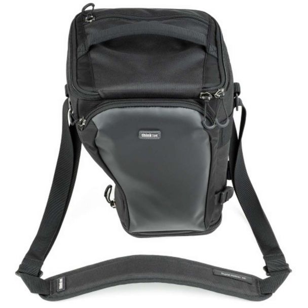 Unieke holster speciaal ontwikkeld voor een camerabody met grip met een 24-70mm f/2.8 met de zonnekap omgedraaid. Als hij is uitgeklapt, past hij op een 70-200mm f/2.8 met de zonnekap omgedraaid.